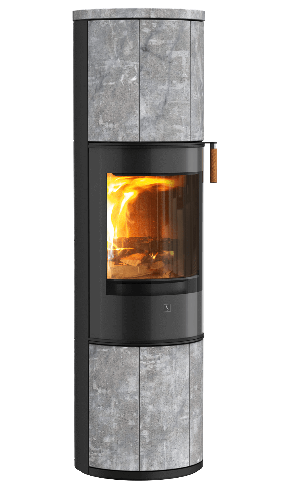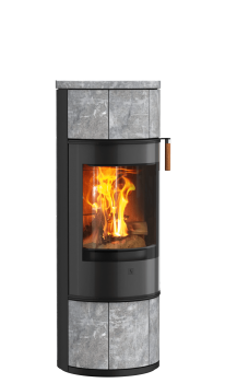 Hoher, schlanker Kaminofen mit wärmespeicherndem Speckstein