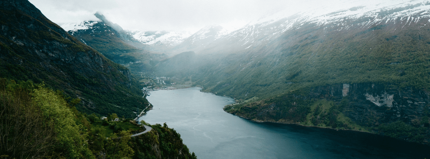 Landschaft mit Fjord und Bergen, Text mit Werbebotschaft: 300 € Rabatt auf die Scan 67 Serie, sauberer heizen mit Zensoric Technologie.